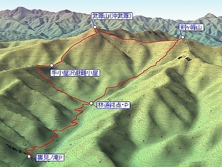 裏見ノ滝駐車場 5:15 ⇒ 6:15 武尊林道終点 6:20 ⇒(休憩5分)⇒ 9:15 剣ヶ峰山 9:40 ⇒(休憩5分)⇒ 11:20 武尊山(沖武尊) 12:15 ⇒(休憩5分)⇒ 手小屋沢避難小屋 14:20 ⇒ 武尊林道終点 15:35 ⇒ 裏見ノ滝駐車場 16:35