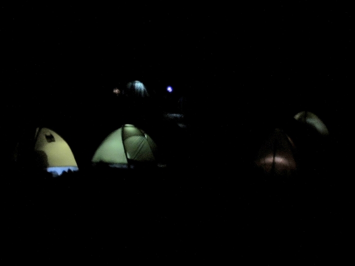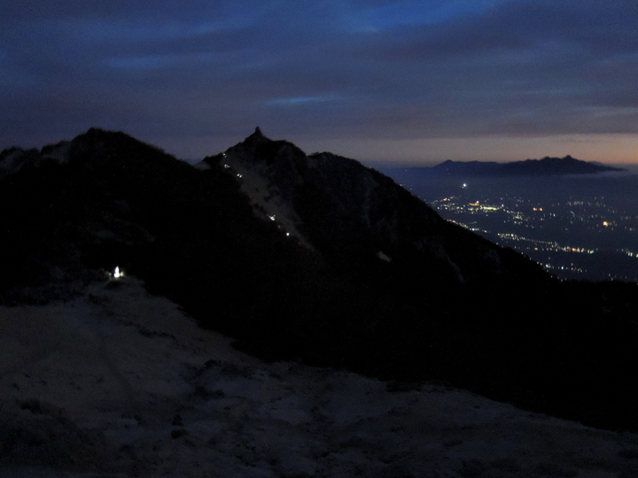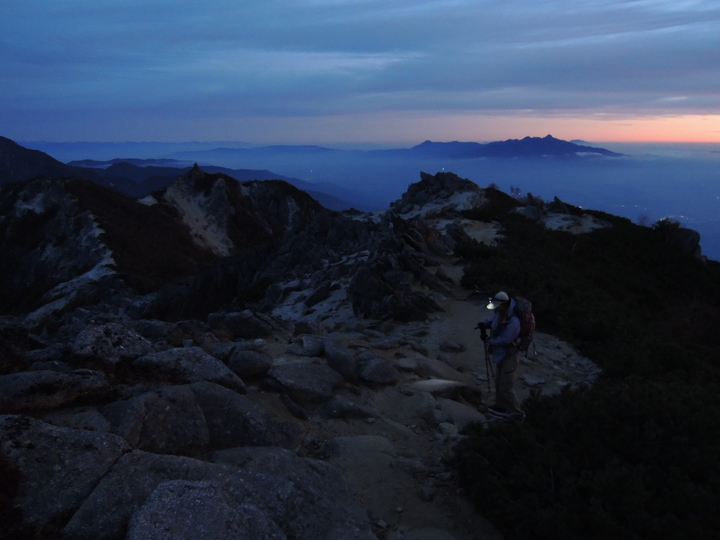 テントを出ると、あちこちで明かりがともっており、出発の準備をしているハイカーが多かった。3:50 鳳凰小屋を出発。周りは真っ暗闇なので、いつも以上にゆっくり上った。出発してすぐに追いついてきた女性3人組が前を歩いていたので、多少なりとも心強かった。
