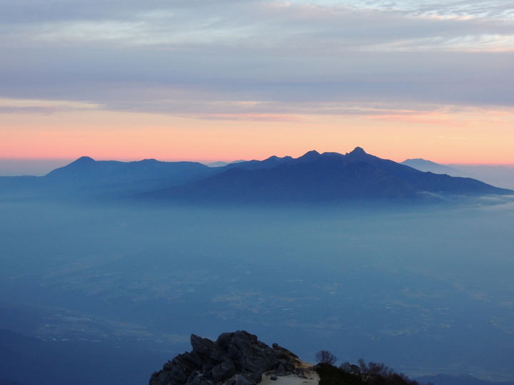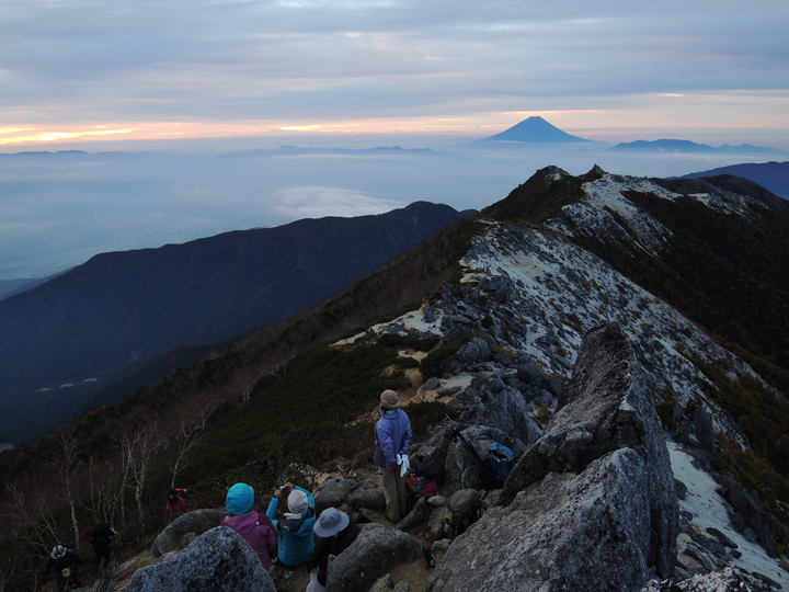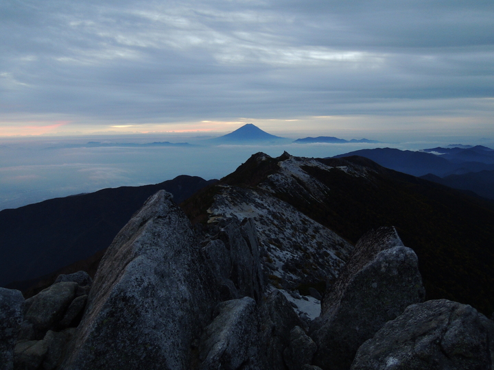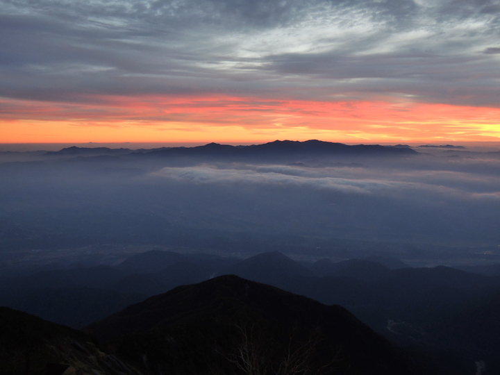 東の朝焼け。左から御座山、小川山、金峰山、国師ヶ岳と続く山塊が雲海に浮かんでいた。右奥には唐松尾山と雲取山、御座山の上には日光白根山と男体山の頭も見えていた。