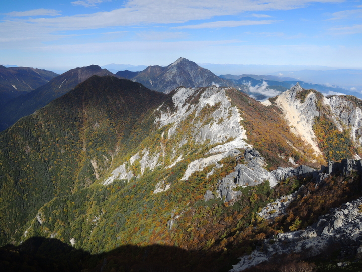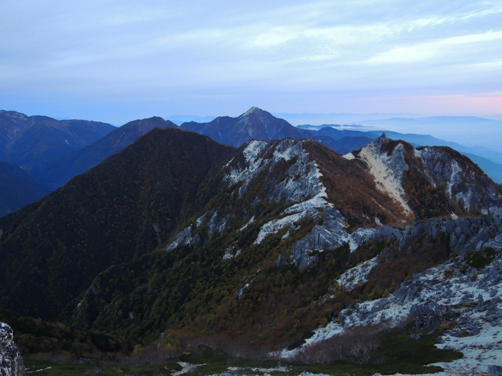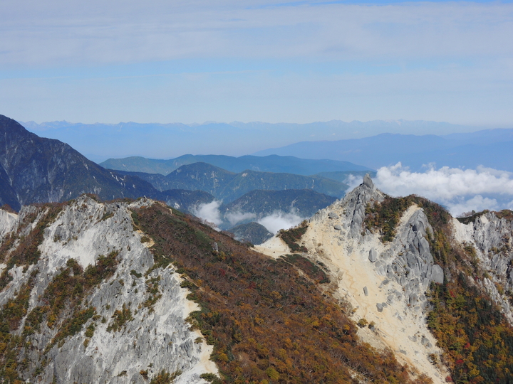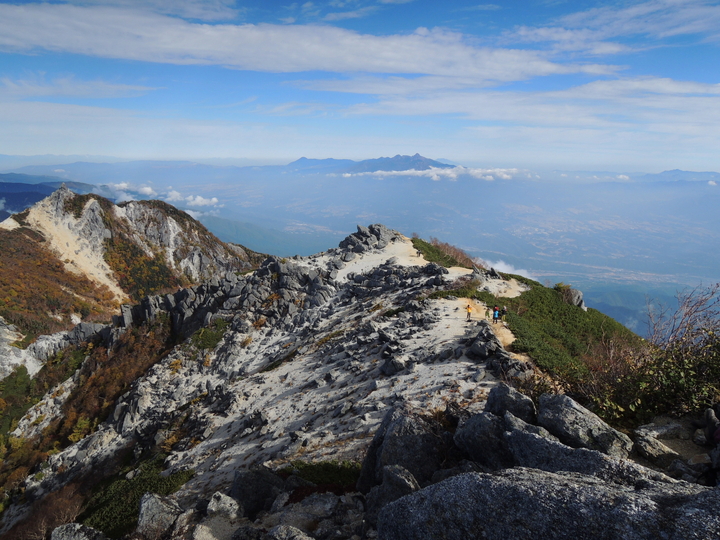 甲斐駒ケ岳の右奥に、穂高連峰と大キレット、槍ヶ岳もくっきり。