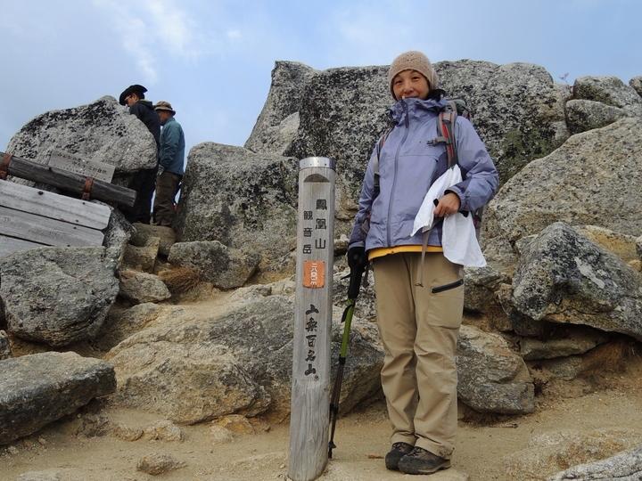 こじんまりした観音岳の山頂標と記念撮影。