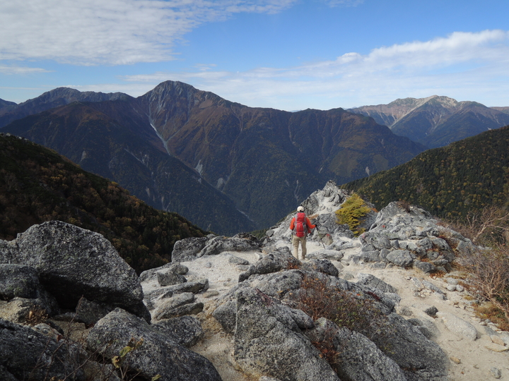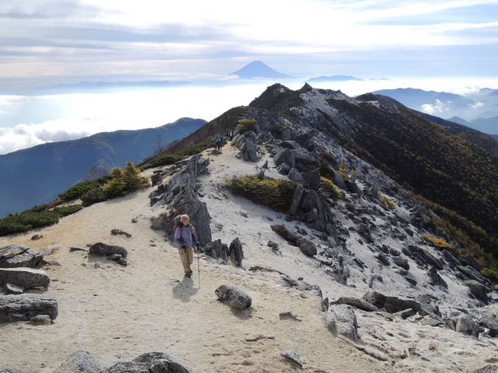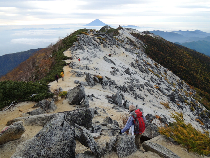 正面には北岳と仙丈ケ岳。鳳凰三山の稜線歩きがこれほど素晴らしいとは想像していなかった。本当に素晴らしいと、しみじみ感じた。