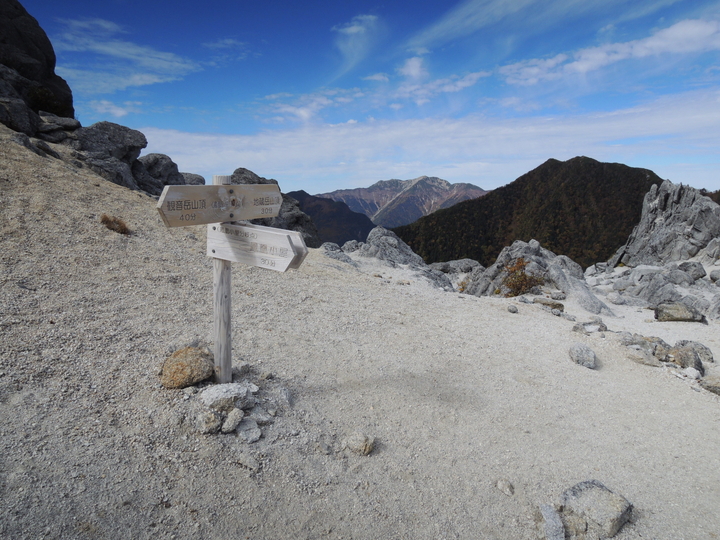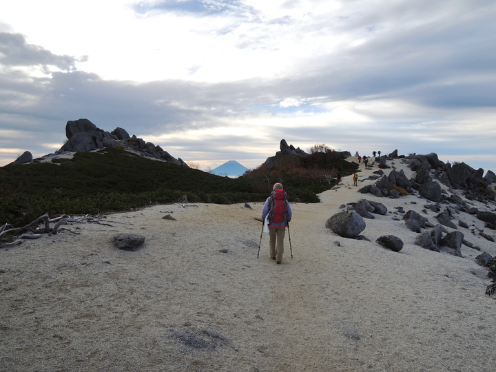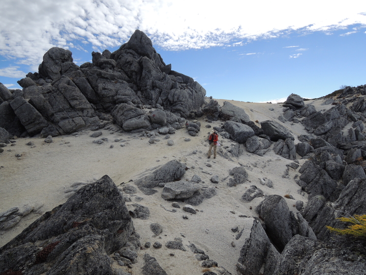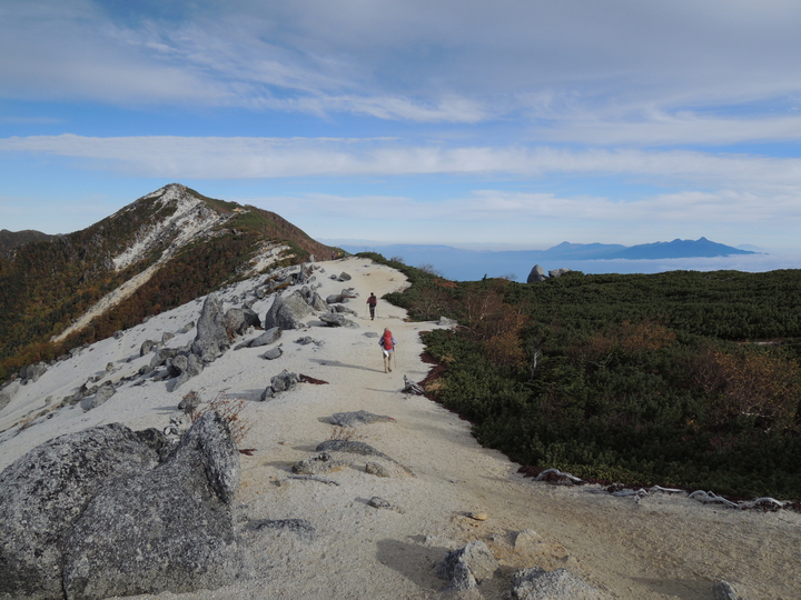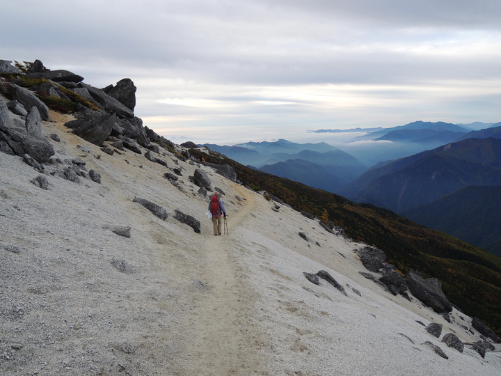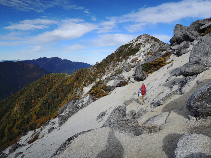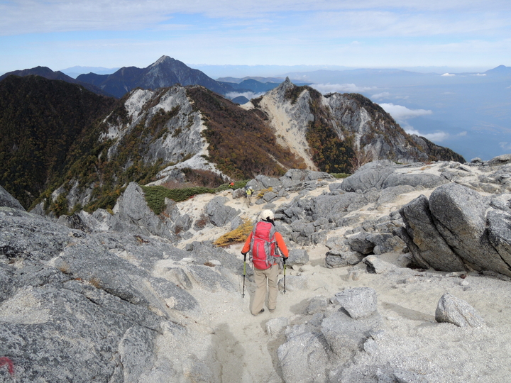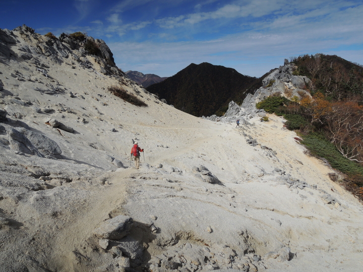 風化した岩稜帯から白砂の斜面を下って行く。