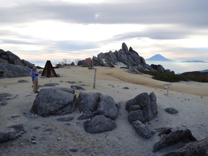 7:05 薬師岳に到着。広い白砂の山頂は、さまざまな形の花崗岩が点在して巨大な庭園のようだった。