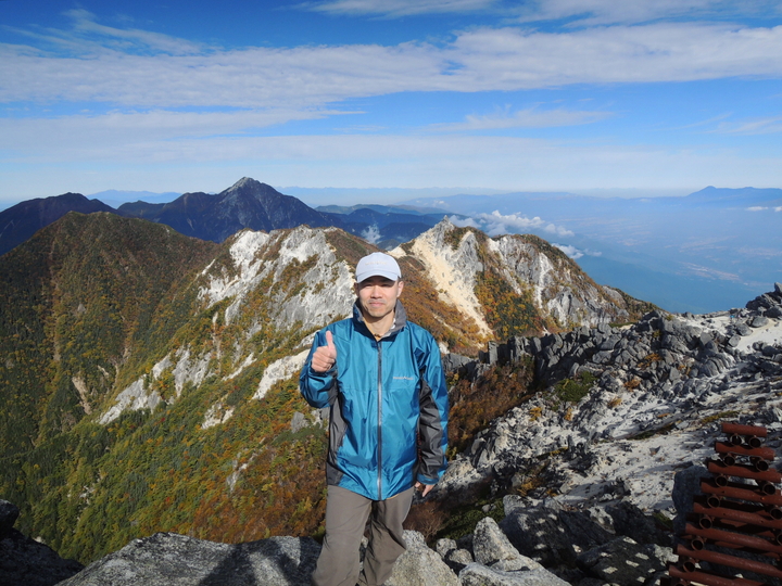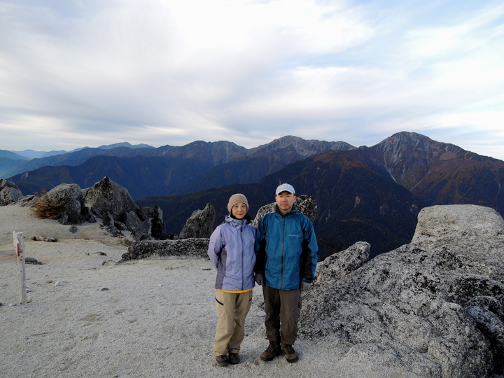 薬師岳の山頂標にカメラを置いてタイマー撮影した。背景は白峰三山。