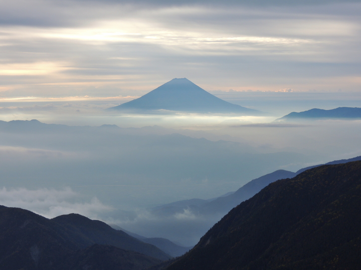 稜線の西側には白峰三山。左奥から千枚岳、悪沢岳、中岳、広河内岳、農鳥岳、西農鳥岳、間ノ岳、北岳と続く山並み。右奥には南駒ヶ岳や空木岳などの中央アルプスも見える。