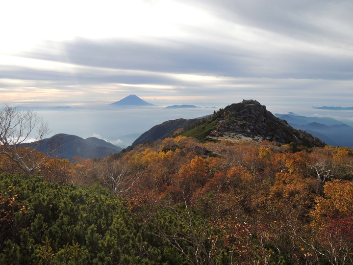 紅葉の向こうに富士山と砂払岳。