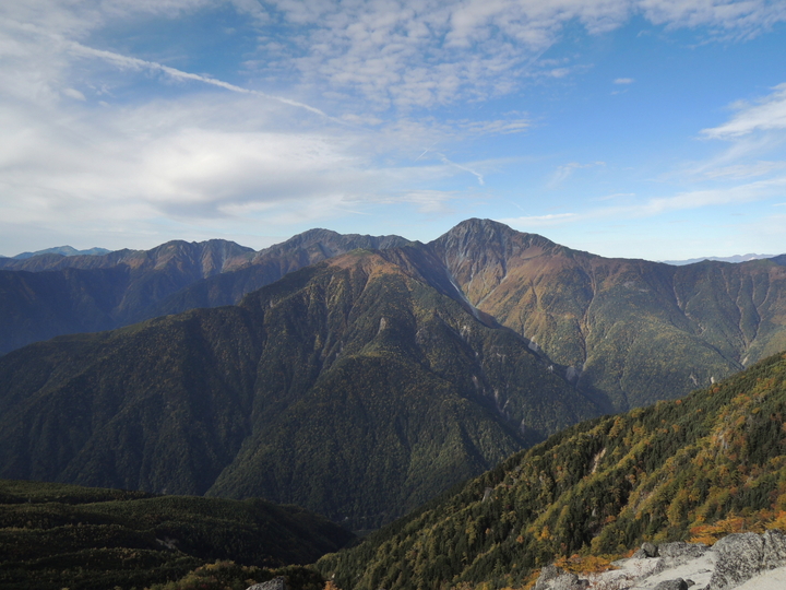 北西側には甲斐駒ケ岳。その背後には北アルプスがずらり。手前には高嶺、赤抜沢ノ頭、地蔵岳が並ぶ。