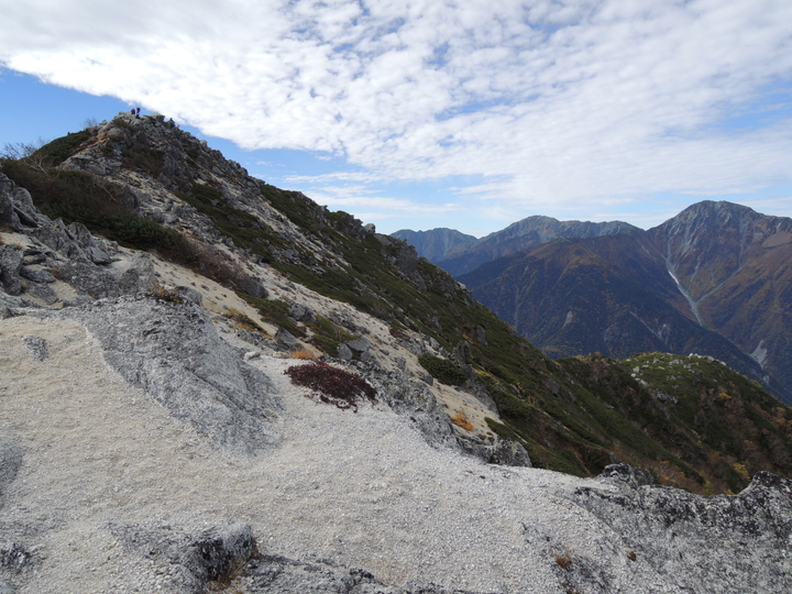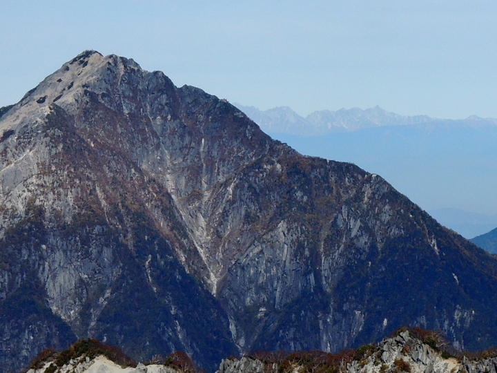 北西方面には高嶺、赤抜沢ノ頭、地蔵岳と並び、その後ろには甲斐駒ケ岳。