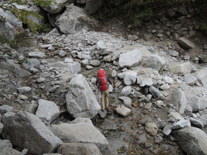 いったん沢の右岸に渡って迂回路を歩き、また沢を渡って左岸へ戻る。
