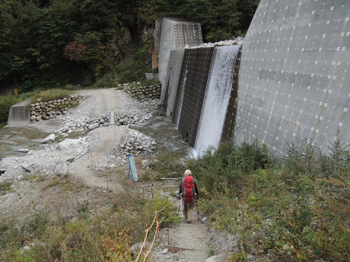 急坂を下り切って15分ほど歩くと「小武川第三砂防堰堤」に出た。ここまでくればあと少しと元気が出た。