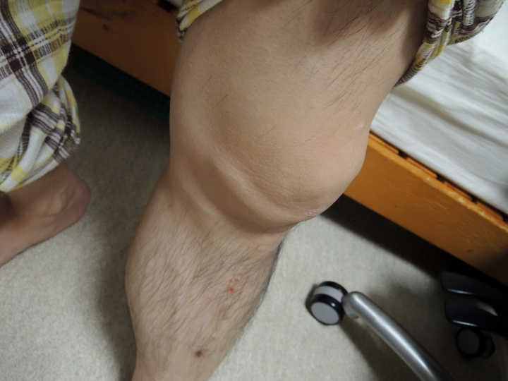 帰宅後、左膝を確認。水が溜まった膝まわりが肥大化して、立つと膝蓋骨が垂れ下がる感じだった。これにはぎょっとなった。