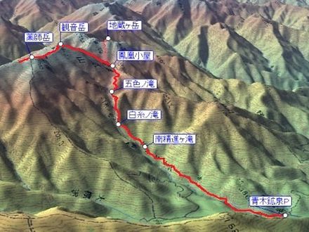 鳳凰小屋 3:50 ⇒ 鳳凰小屋分岐点 5:00 ⇒ 5:40 観音岳 6:30 ⇒ 7:05 薬師岳 7:20 ⇒ 7:25 薬師小屋 7:30 ⇒ 7:40 薬師岳 7:50 ⇒ 8:35 観音岳 9:25 ⇒ 鳳凰小屋分岐点 9:50 ⇒ 10:30 鳳凰小屋 11:30 ⇒ 12:20 五色ノ滝(上) 12:25 ⇒ 12:55 白糸ノ滝 13:00 ⇒ 13:50 鳳凰ノ滝 13:55 ⇒ 14:30 南精進ヶ滝 14:35 ⇒ 青木鉱泉P 16:05
