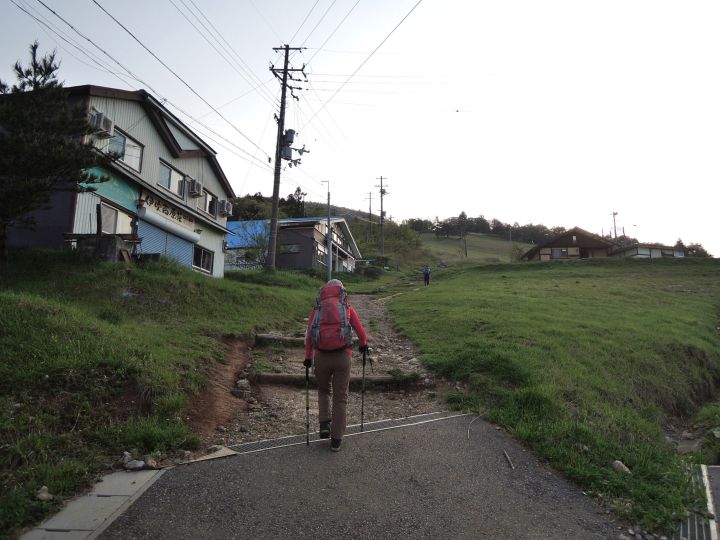 駐車代を徴収しにきたおばあさんに1,000円支払い、5:30 登山スタート。山頂まで6kmの表示あり。
