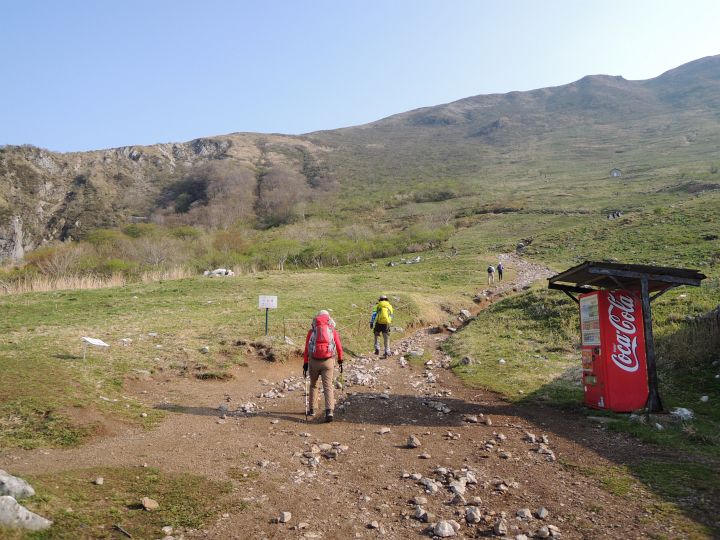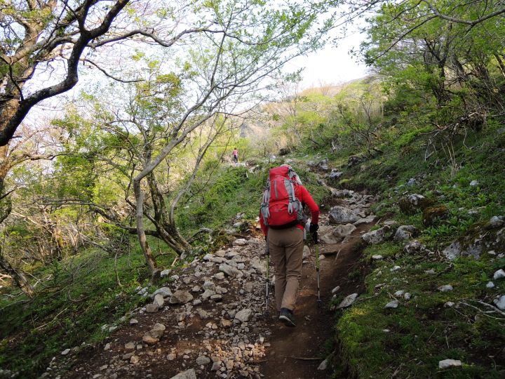 九十九折りの道には登山者の列。さすがゴールデンウィークの百名山です。登山道がそこそこ広いので、すれ違うのに待つ必要がある場所は限られていた。