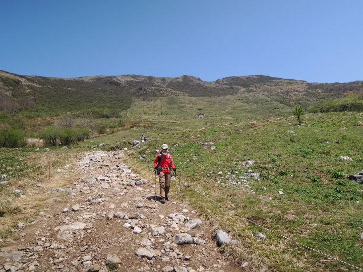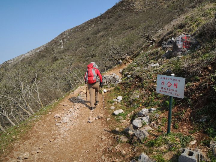 5合目以降は日陰がいっさいなくなり、伊吹山の山容を見上げながら上ることになる。先を進む登山者の姿がよく見えた。