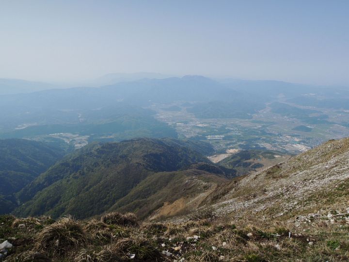 南側を見下ろすと上ってきた登山ルートが一望できた。その向こうは霊仙山。