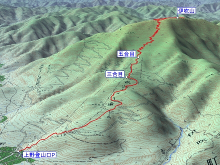 上野登山口P 5:30 ⇒ 7:10 3合目 7:15 ⇒ 5合目 7:40 ⇒ 8合目 8:35 ⇒ 8:55 伊吹山 10:30 ⇒ 8合目 10:50 ⇒ 5合目 11:30 ⇒ 3合目 11:50 ⇒ 上野登山口P 12:45