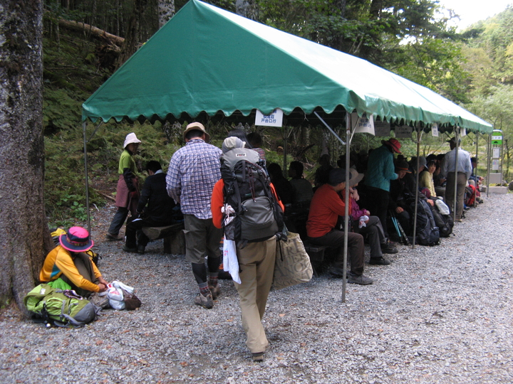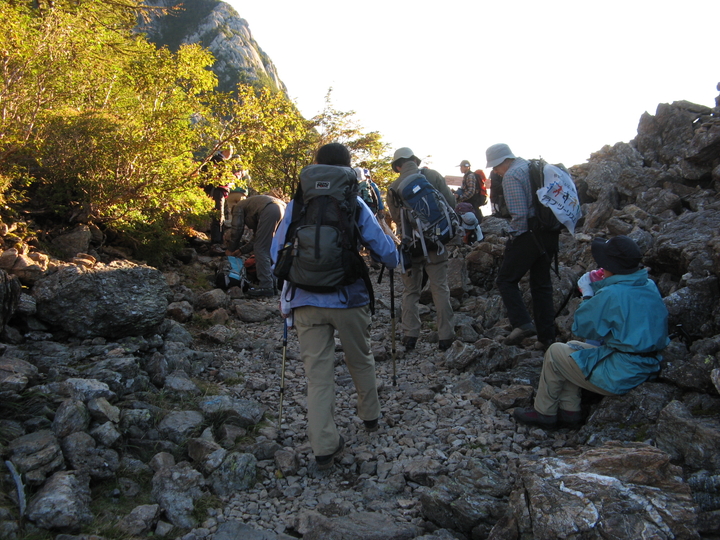 6:20 ゴーロを20分ほど歩くと仙水峠に着いた。峠は休憩中の団体ハイカーでにぎわっていた。