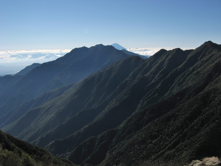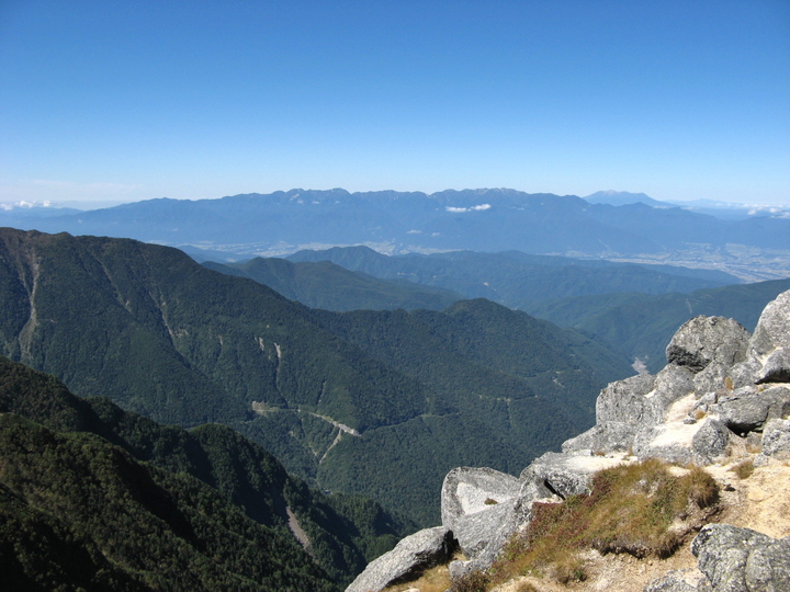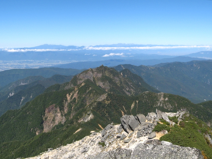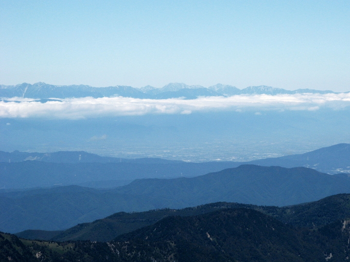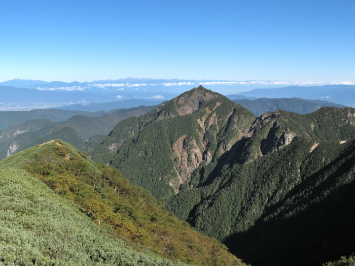 南東側。鳳凰三山の右上に富士山がわずかに見えていた。右端はアサヨ峰。