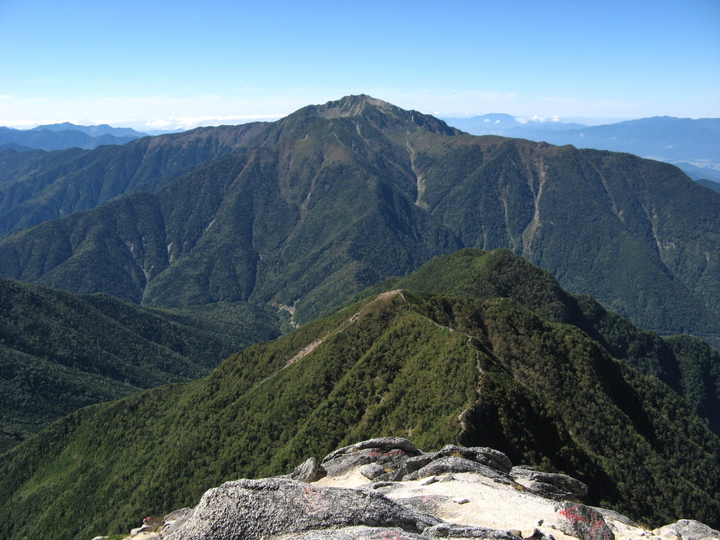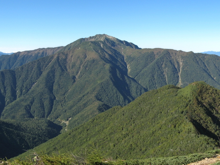 南側は、北岳、間ノ岳、悪沢岳、赤石岳、塩見岳、兎岳、中盛丸山、小河内岳と続く南アルプスの山並みが一望できた。手前はアサヨ峰と悪沢山。