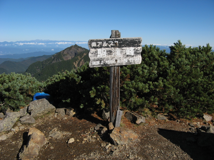 12:50 標札だけのこじんまりした双児山に到着。甲斐駒ヶ岳と駒津峰が遠くなってきた。