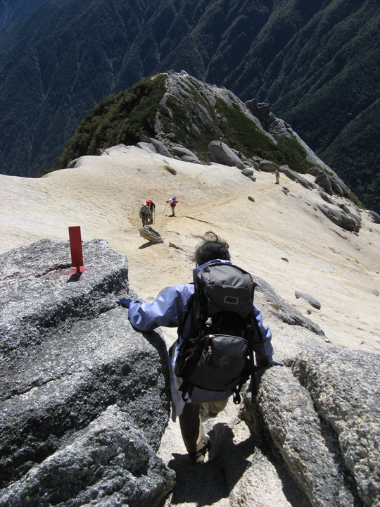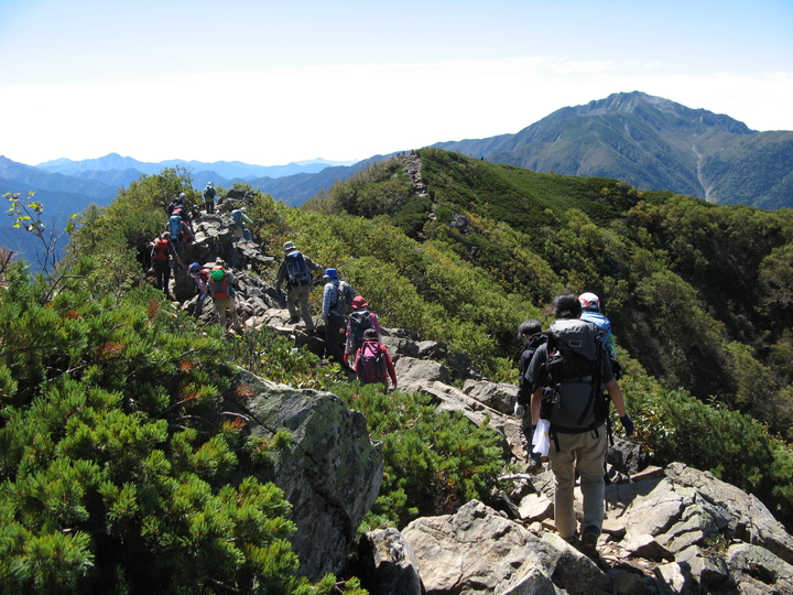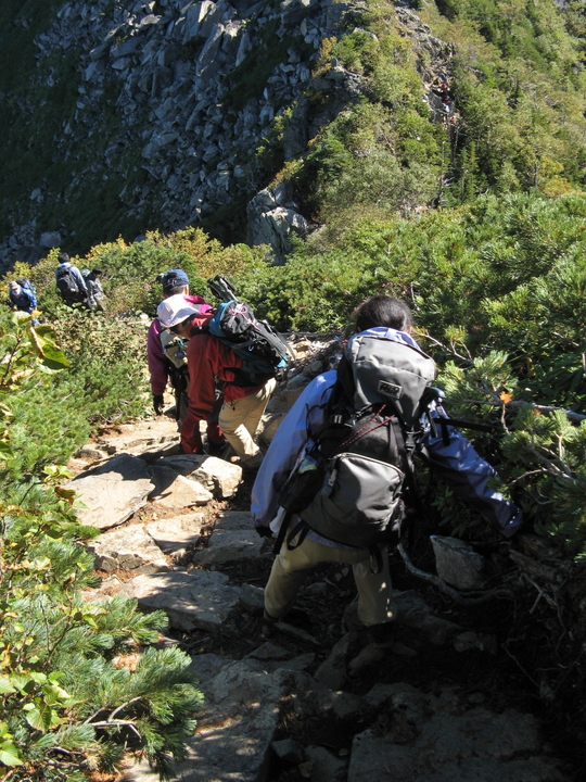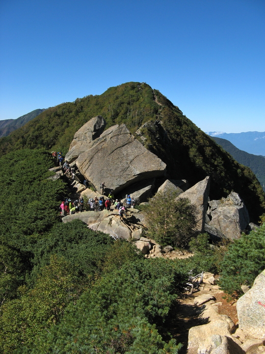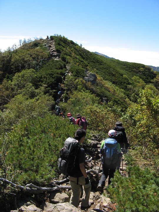駒津峰からはヤセ尾根の険しいコースとなり、場所によっては渋滞が発生していた。