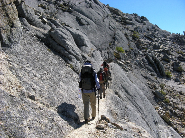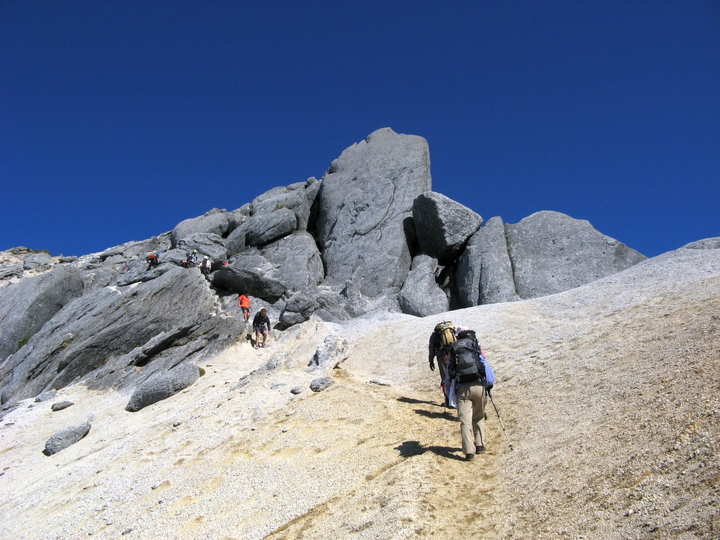 後ろからは続々と上ってくる団体ハイカー。花崗岩は、御影石という名前でも知られる白くて鉱物の粒が粗い岩石で、火山岩と同じくマグマが冷えて固まったものだが、花崗岩は地底の深いところでゆっくり冷えたものなので結晶が大きい。