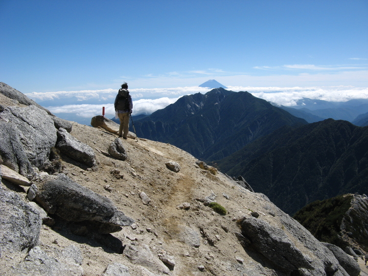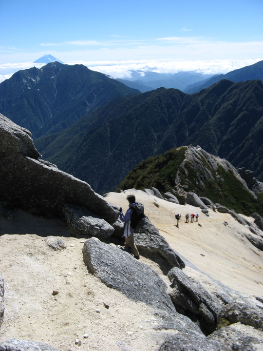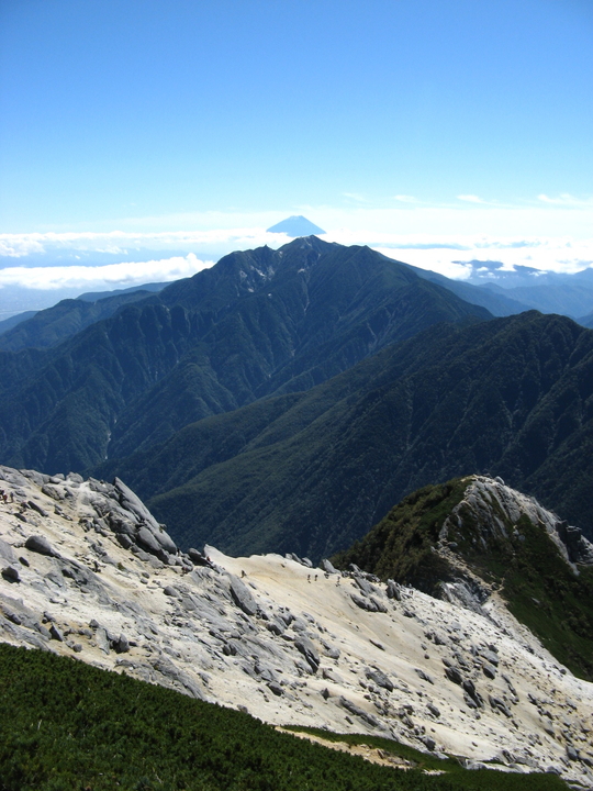 奥には富士山と鳳凰三山。眼下には摩利支天を眺めながら下る。