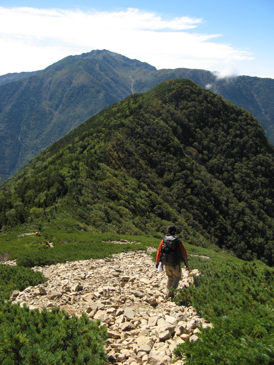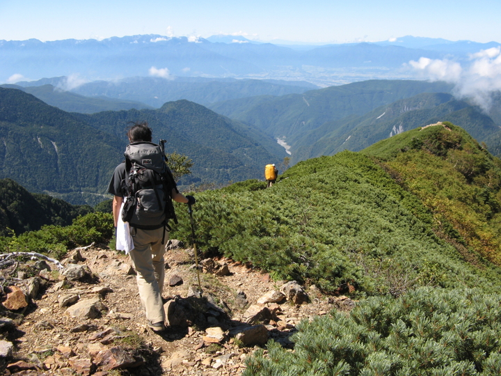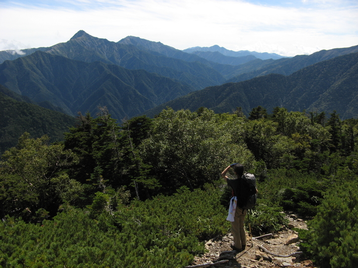 樹林帯を抜けてハイマツ帯に入ると、背後の景色が開ける。