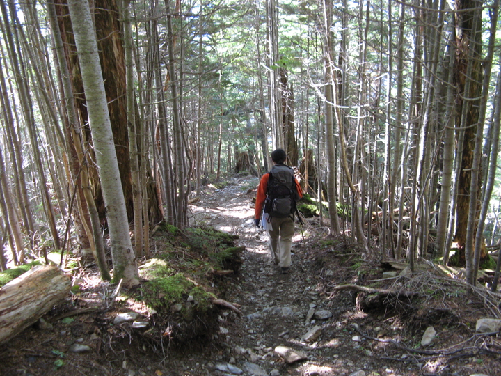 薄暗いシラビソの樹林帯を歩く。