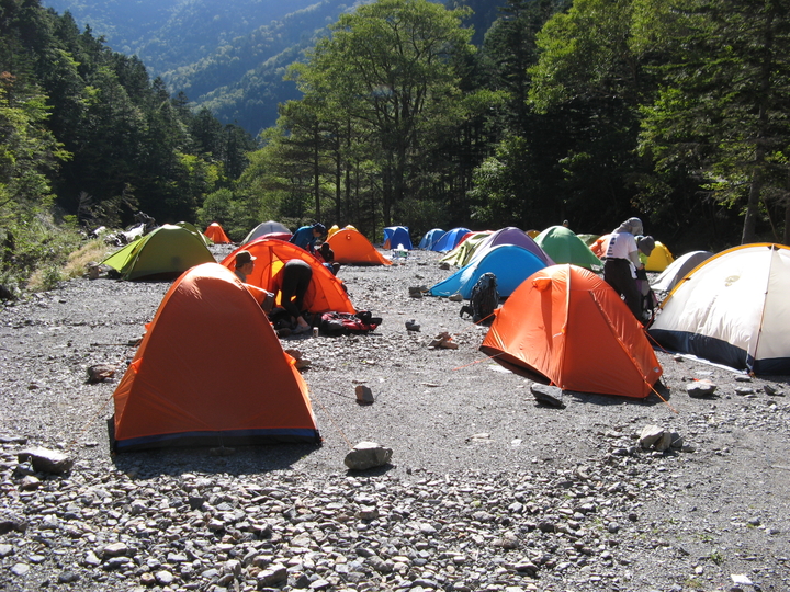 カラフルなテントが並ぶ。すぐ横の沢で足裏を冷やしてから撤収開始。シュラフやマットを片付けてテントを畳んだ。
