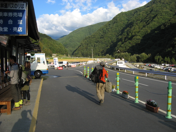長衛荘前のバス停へと向かう。食糧と飲料水が減っても、ずしりと荷物は重かった。