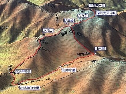 北沢駒仙小屋 4:50 ⇒ 5:40 仙水小屋 5:45 ⇒ 6:20 仙水峠 6:25 ⇒ (休憩 10分) ⇒ 8:05 駒津峰 8:25 ⇒ 9:50 甲斐駒ケ岳 10:55 ⇒ 12:05 駒津峰 12:15 ⇒ 12:50 双児山 12:55 ⇒ 13:30 中間点 13:35 ⇒ 長衛荘 14:15 ⇒ 北沢駒仙小屋 14:25