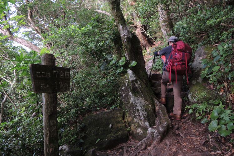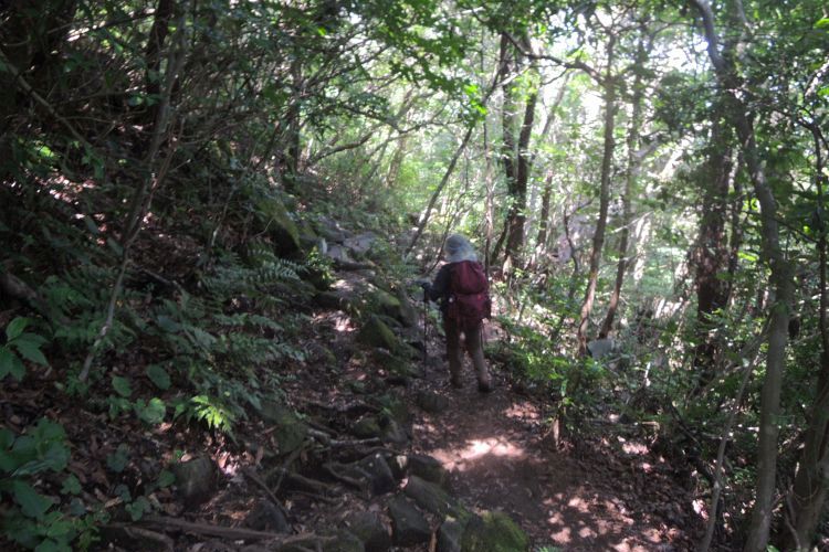 登山道は浸食がひどく、足元は滑りやすかった。 いつものベースで上っていると、すぐに大量の汗が噴き出てきた。そのうちまず私が気持ち悪くなってきて、油断すると目が回りそうな気がしてきた。前夜、熱帯夜でほとんど寝ていない状態だったので、この時は本当にマズイと感じていた。 嫁に声をかけて、水分をこまめに補給し、なるべく汗をかかないように、ペースをぐんと落として心拍の上昇を抑えるが、今度は嫁の調子が悪くなってきた。 関東の山とは少し違って、樹林が熱帯のように鬱蒼と深く、風がまるで通らない。どれほどゆっくり歩いても尋常ではない汗の流れは止まらなかった。