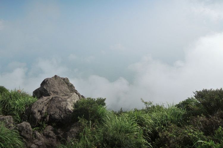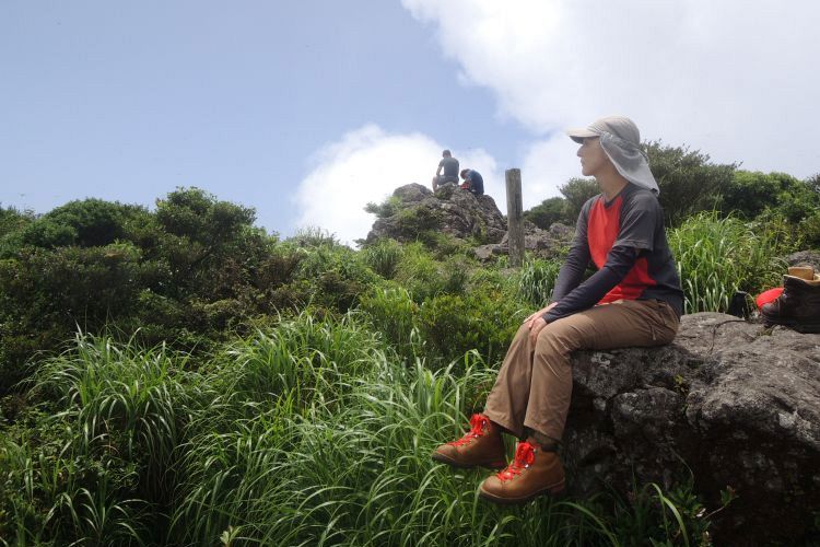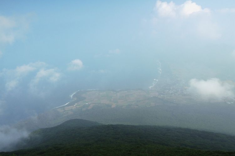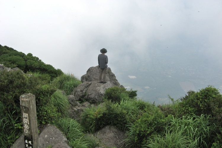 ときおり心地よい風が吹き抜けて、どこからか湧いてくる雲もどんどん流れていく。開聞岳は4000年ほど前に起きた海中噴火で急速に成長した山と言われ、山体は二重構造で、玄武岩の上に堅固な安山岩のドームが乗っかっている。