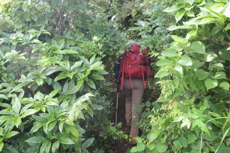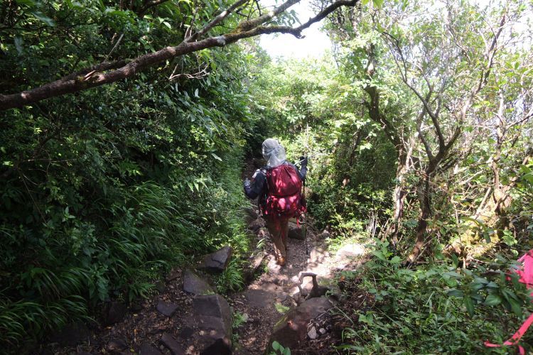 濃密な緑の中を下っていく。歩き始めると、すぐに汗が噴き出てきた。