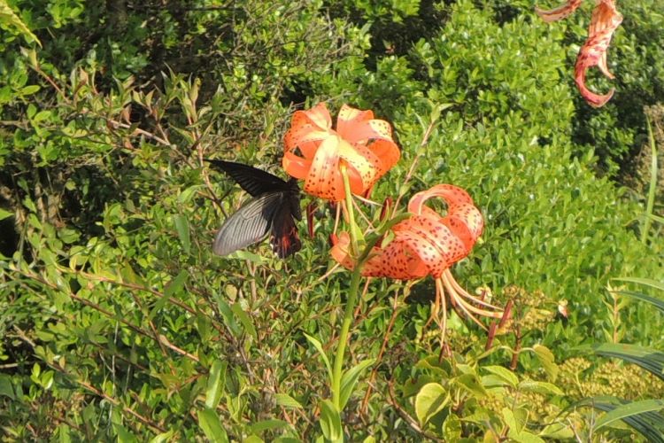 クロアゲハやアゲハチョウがユリの蜜を吸っていた。