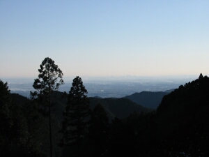 花立松ノ峠の手前で振り返ると、東京のビル群と筑波山が遠くに見えた。