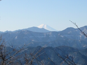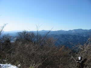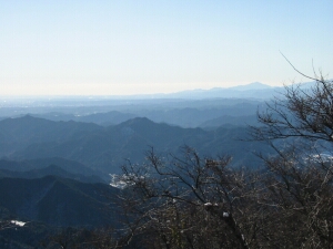 南西方面の中央に大岳山、その右には白い富士山が見える。