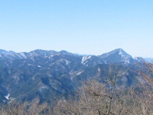 南西方面。左から日向沢ノ峰、蕎麦粒山、ほぼ中央に天目山(三ツドッケ)、大平山、右端に酉谷山と続く。