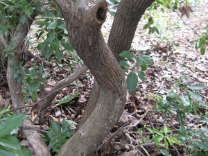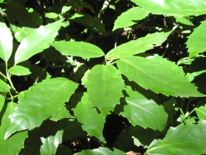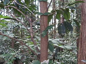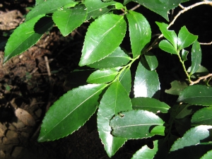 葉は互生の鋸歯縁。身近な林にごくふつうに生える常緑樹。葉先がわずかにくぼむのが特徴。樹皮は滑らか。
