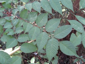 ヤマウルシ (山漆)。ウルシ科ウルシ属の小高木。葉は奇数羽状複葉で樹液にふれるとかぶれる。葉柄はふつう赤く、下部の小葉ほど小さく丸い。幼木の葉はしばしば鋸歯が出る。樹皮は縦に浅く裂ける。