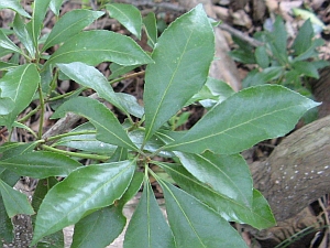 アセビ (馬酔木)。ツツジ科アセビ属の低木。葉は互生の鋸歯縁で先に近い部分で最大となり、枝先に集まってつくのが特徴。