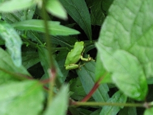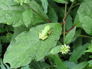 水辺に近寄ってみると、突然ニホンアマガエルが現れた。