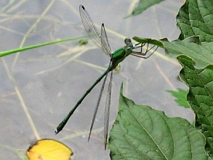 すぐ近くの葉っぱに止まったオオアオイトトンボ。背中のメタリック・グリーンが鮮やか。
