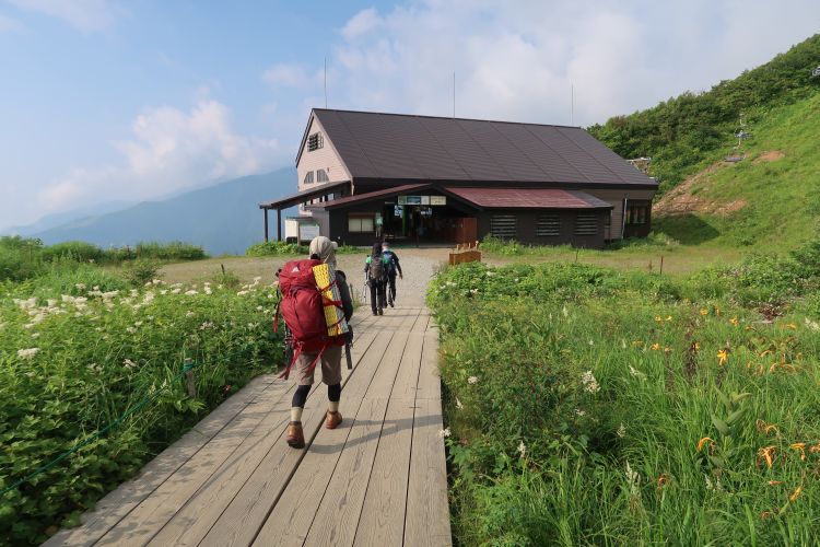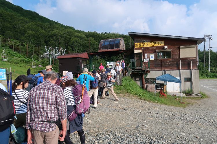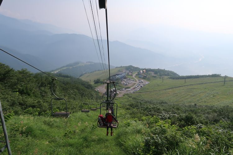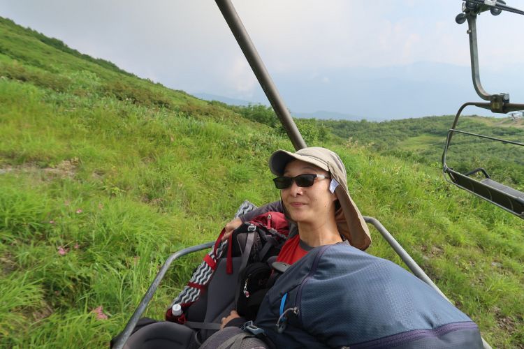 チケットは黒菱第三リフトとグラードクワッドリフトの往復に八方温泉の入浴券を付けて、1人1,600円だった。第三リフトは荷物が大きいので1人ずつ乗った。足が地面に届きそうなところでは、足元に咲く高山植物がよく見えた。
