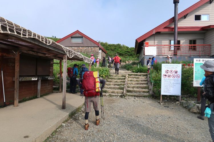 約5分で八方山池山荘に到着。靴ひもを締め直して、7:45 登山スタート。ここからは自分の足で上る。