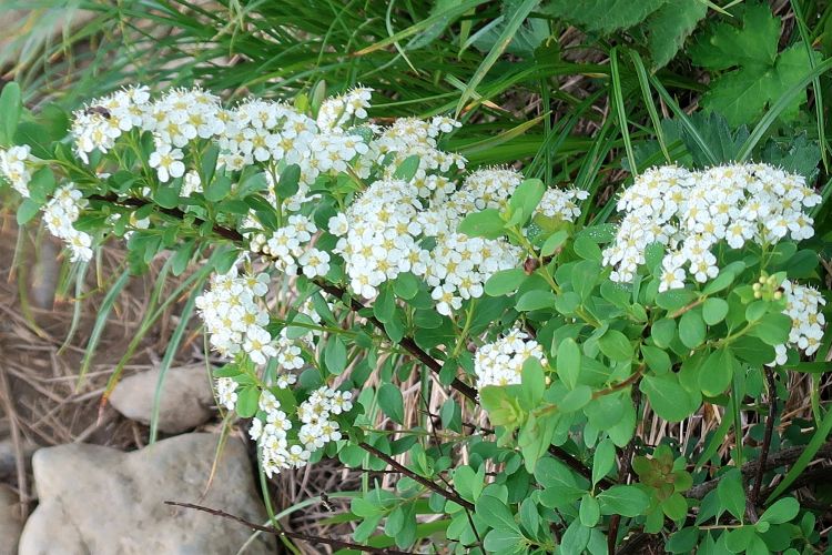 バラ科のイワシモツケ。マルバシモツケの葉が重鋸歯を持っているのに対して、本種の葉は全縁に近い。