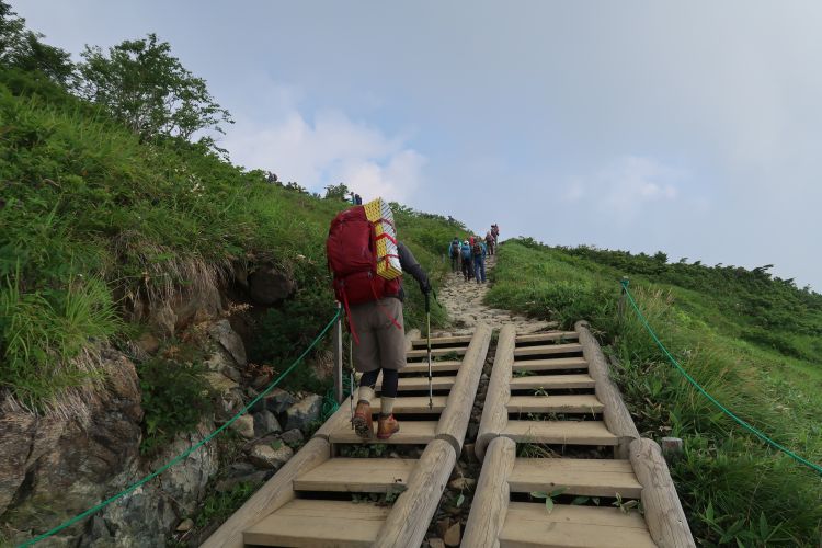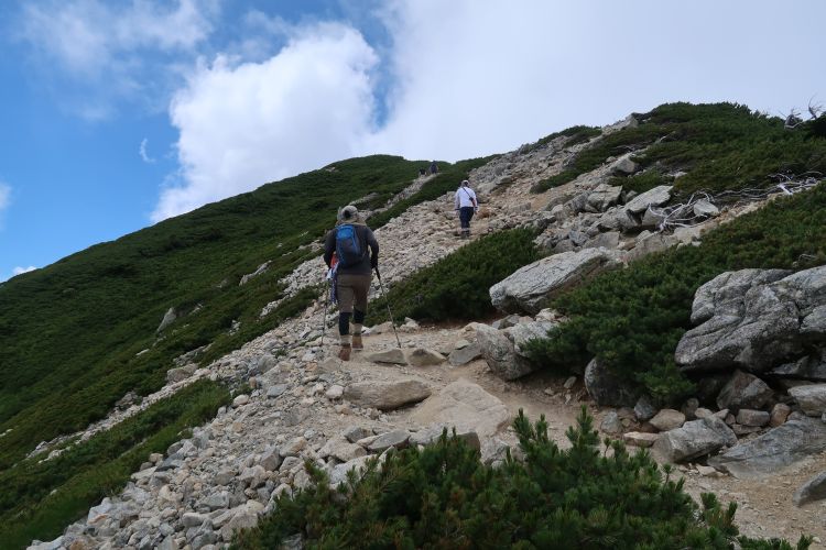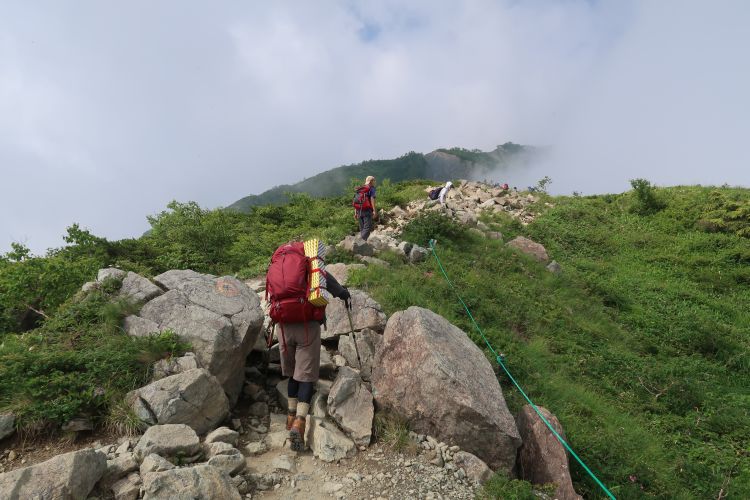 岩の急坂を一歩ずつ上る。日差しの出る時間帯が増えて、暑さが増してきた。